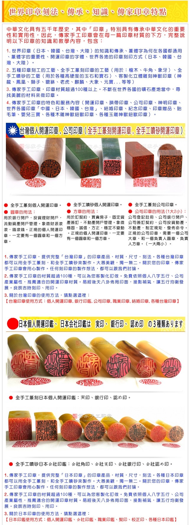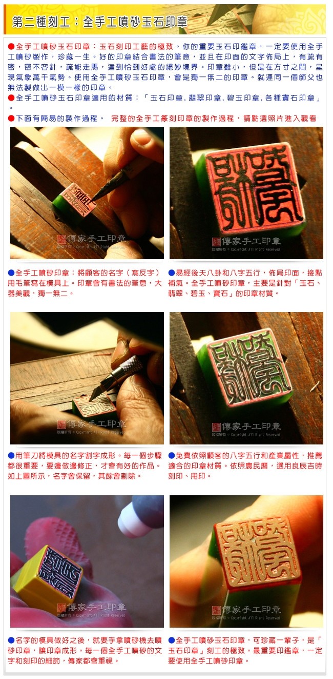 ★傳家手工印章有五種刻印工法。推薦您「全手工篆刻和全手工噴砂印章」:大器美觀,書法筆意, 篆刻刀藝,獨一無二,無法模仿。